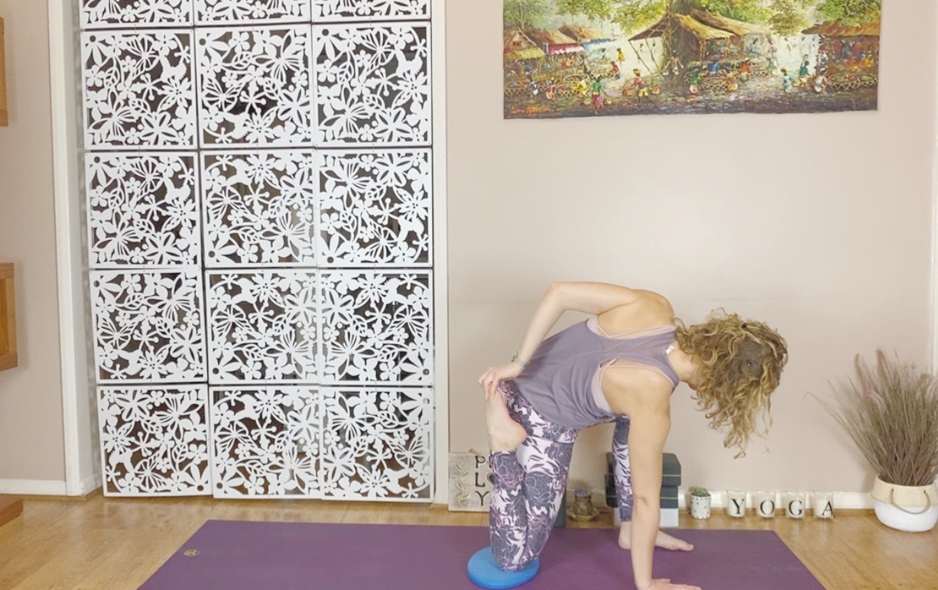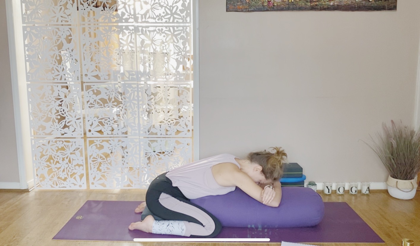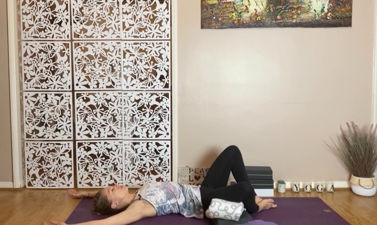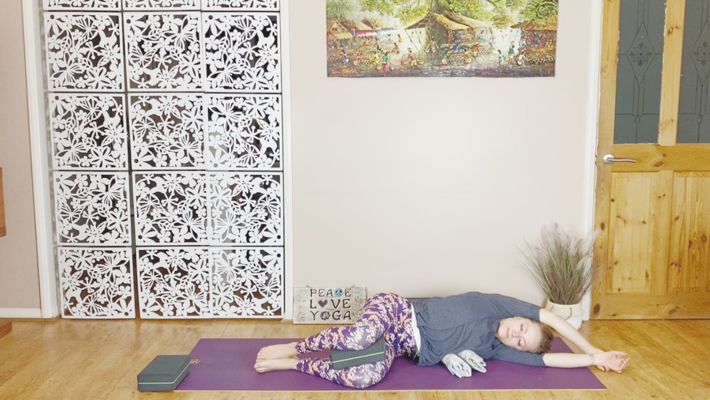 Props; a rolled up blanket or towel and 2 blocks and/or cushions. Unwind as we use the hands and props to create length in the side body and QL at the lower back. Your breath will be fuller and less restrictive after a calm practice.